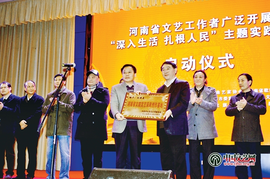 2014年11月,河南省文藝工作者“深入生活 扎根人民”主題實踐活動在社旗縣啟動,河南省文聯黨組書記吳長忠(前排右)向社旗縣授予“河南省文聯文藝采風創作基地”牌匾