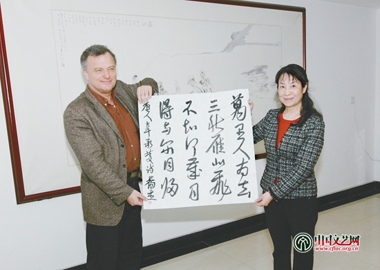 2014年3月,戴高樂基金會副主席俊馬(左)訪問河南省文聯,河南省文聯主席楊杰(右)向對方贈送書法作品