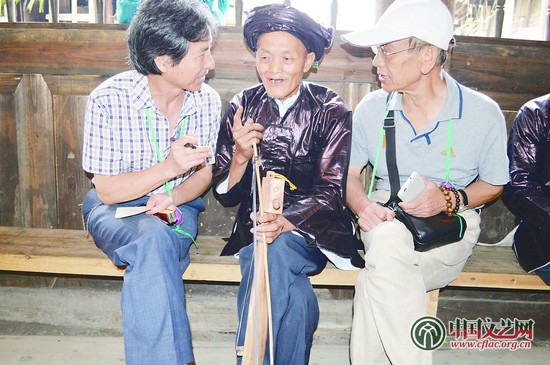 采風團在榕江縣宰蕩侗寨和當地的民間藝人交流