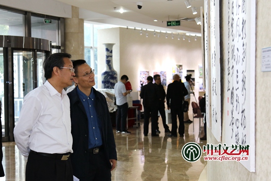 中國文聯黨組成員、副主席郭運德和中國文聯文藝資源中心主任、中國藝術報社社長向云駒參觀展覽 中國文藝網 王渝 攝
