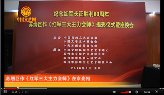 為紀(jì)念紅軍長征勝利80周年,中國民協(xié)、中國文學(xué)藝術(shù)基金會、蘇州市委宣傳部等9月29日在北京共同舉辦蘇繡巨作《紅軍三大主力會師》揭彩儀式暨座談會。作品以蘇繡絲線特有的質(zhì)感風(fēng)格再現(xiàn)了波瀾壯闊的中國革命歷史畫卷,表達(dá)了對革命前輩的深情緬懷。中國文聯(lián)黨組書記、副主席趙實與蘇繡藝術(shù)家盧招娣共同為這一蘇繡巨作揭彩。