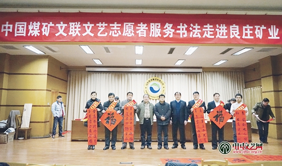 2015年1月20日,中國煤礦文聯副主席兼秘書長張強一行赴山東能源新礦集團良莊礦業公司開展中國煤礦文聯書法志愿者送文藝到基層活動。圖為志愿者向新礦集團職工贈送春聯等書法作品