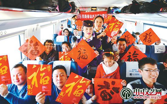 上海鐵路局南京客運(yùn)段在全段擔(dān)當(dāng)?shù)母鞔瘟熊嚿祥_展了鐵路春運(yùn)送萬福大型公益活動。圖為上海虹橋開往北京南的G118次列車上,列車工作人員向旅客贈送福袋,送上祝福 金長曜