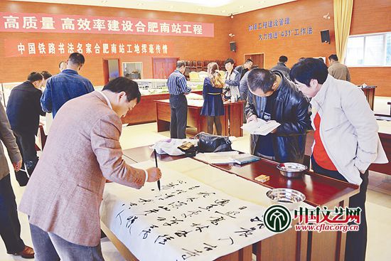 中國鐵路書法家在合肥南站工地?fù)]毫傳情