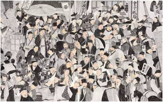 《宋代交子與紙幣發(fā)行》的整個創(chuàng)作過程,對周京新來講,就是深入到傳統(tǒng)和歷史之中,深入到具體生活的縫隙之中,扎根人民,在積累和解決問題的過程中獲得了突破。周京新說,很多同行的朋友說我們畫的這種感覺不一樣了,有不同了,我覺得這就是創(chuàng)新。創(chuàng)新都是有淵源、有道理的,不能隨便亂創(chuàng)、不能把自己胡來,或者不到位的一些做法,就當成是創(chuàng)新,不能說只要跟以前不一樣了就是創(chuàng)新。習總書記說既要像小鳥一樣在每個枝丫上跳躍鳴叫,也要像雄鷹一樣從高空翱翔俯視。我覺得這就像畫畫的空間關系處理一樣,在《宋代交子與紙幣發(fā)行》中,既要有宋代的整體歷史氣息,又要有微觀的、對每個人物眼神、服飾等細節(jié)的深入把握和了解。我覺得在我們的創(chuàng)作中,總書記說的很多精彩論斷,用在我們繪畫理論上,都是相通的,宏觀的非常到位,微觀的非常精準。周京新說,大道理都是相通的,正大的道理、堂堂正正宏觀的大道理都是和微觀相通的,習總書記的講話,和文藝家具體在做的工作、創(chuàng)作都是相通的,一點都沒有隔閡,是對文藝家最大的促進和鞭策。