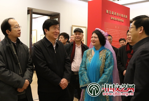 中國(guó)文聯(lián)黨組副書(shū)記、副主席李屹,中國(guó)文聯(lián)黨組成員、副主席左中一,中國(guó)美術(shù)家協(xié)會(huì)分黨組書(shū)記、駐會(huì)副主席、秘書(shū)長(zhǎng)徐里與少數(shù)民族畫(huà)家觀展交流 中國(guó)文藝網(wǎng) 段冉攝