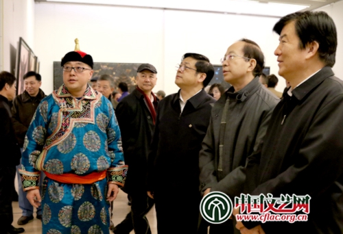 中國(guó)文聯(lián)黨組副書(shū)記、副主席李屹,中國(guó)文聯(lián)黨組成員、副主席左中一,中國(guó)美術(shù)家協(xié)會(huì)分黨組書(shū)記、駐會(huì)副主席、秘書(shū)長(zhǎng)徐里與少數(shù)民族畫(huà)家王圓(莫日根)觀展交流 中國(guó)文藝網(wǎng) 段冉攝