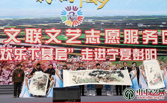 中國文聯黨組書記、副主席趙實,中國文聯黨組成員、副主席李前光與書法家、美術家向彭陽人民贈送書法和美術作品。中國文藝網 周春桃 攝