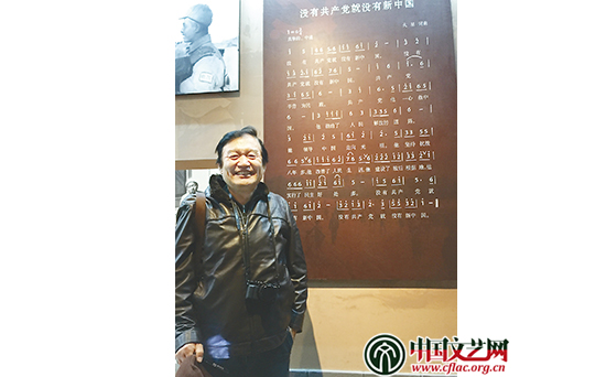 王興東在西柏坡紀(jì)念館中的《沒有共產(chǎn)黨就沒有新中國》歌譜前留影