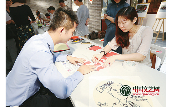 在廣州文藝市民空間二樓的嶺南活力非遺藝術館,幾十位廣州藝術家志愿者忙得熱火朝天,書法家現場揮毫,畫家和漫畫家為干警們畫像,攝影家為干警拍肖像,剪紙藝術家則為干警肖像剪紙……