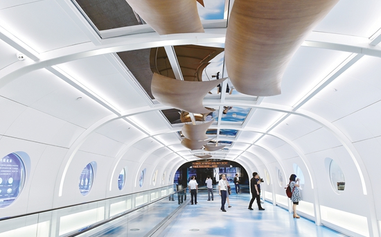 廣州白云國(guó)際機(jī)場(chǎng)與廣東省博物館合作打造的大型“絲路主題”公共藝術(shù)空間、大型歷史文化長(zhǎng)廊——“海天走廊”日前正式開通迎客。該通道全長(zhǎng)200米、面積約3300平方米。首期開設(shè)“牽星過洋——廣州海貿(mào)傳奇”主題展覽,講述廣州作為“海上絲綢之路”發(fā)祥地之一的貿(mào)易歷史,展品包括跨越唐、宋、明、清代的特色瓷器、銀飾品等。圖為觀眾在“海天走廊”觀看“海上絲綢之路”展覽。