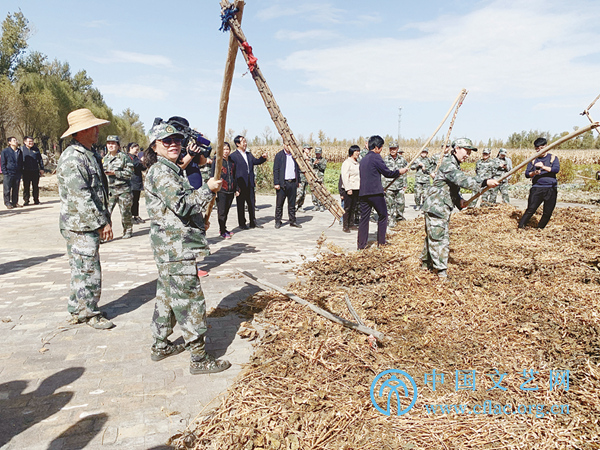 藝術(shù)家在榆林女子治沙連與大家一起打豆子