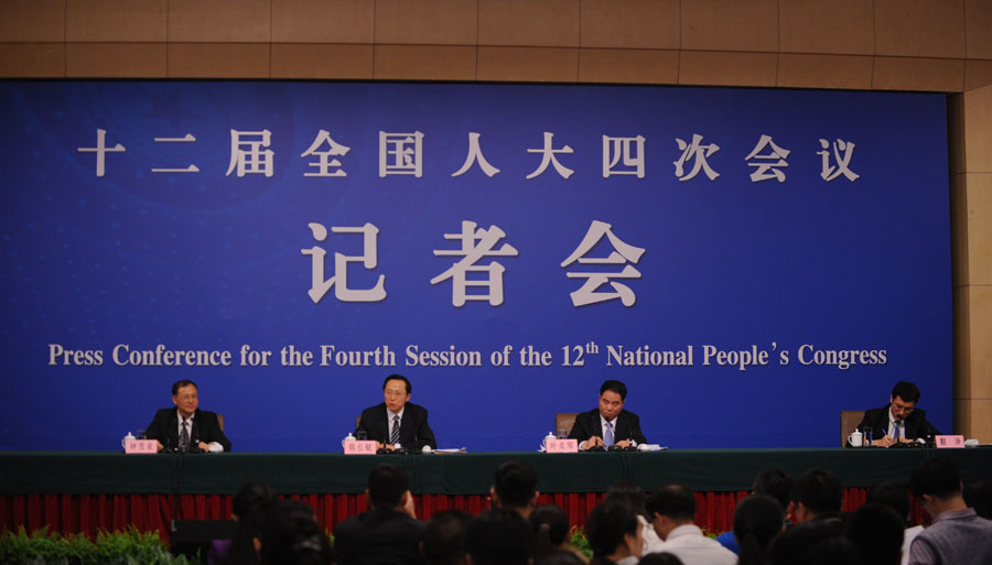 十二屆全國人大四次會議新聞中心于3月7日(星期一)10時45分在梅地亞中心多功能廳舉行記者會,邀請農業部部長韓長賦、新聞發言人葉貞琴就“轉方式調結構 加快發展現代農業”的相關問題回答中外記者的提問。圖為記者會現場 。新華網/中國政府網記者 陳杰 攝
