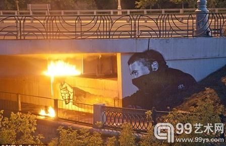 以立交橋底座為畫板,畫出蒙面人點火