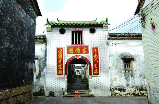 吉塘圍整體呈正方形,面寬60米,進深62米,圍內正中央并排著16座雙層潮式下山虎(爬獅)格局民居,四橫四縱,坐北朝南,四周各有12間房屋環(huán)繞,合攏成“口”字形密實外圍,只開一個南門,上蓋門樓。房屋的墻角均用花崗巖條石砌筑,青瓦硬山頂,呈現(xiàn)出顯著的清中期建筑風貌。
