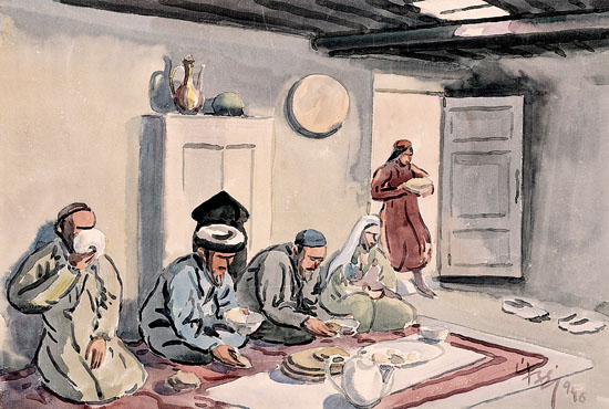 維族用餐(水彩畫) 一九四六年 韓樂然