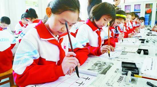 北京掛牌小學(xué)規(guī)范漢字試點學(xué)校,對如何進(jìn)行漢字書寫出臺專門實施方案;南寧抽樣考核學(xué)生卷面書寫;常州實施書法教育“百千萬工程”8年有余,建立64家書法特色學(xué)校,培訓(xùn)500多位教師、6000多名小小書法家;深圳保安黃埔小學(xué)實施“五個一工程”:每天認(rèn)真習(xí)字一刻鐘、每周一節(jié)書法課、每周一份書法作業(yè)、每月一次書法習(xí)作展、每個寒假寫一次春聯(lián)。“書法使我對中國文化產(chǎn)生強(qiáng)烈興趣,上了中學(xué),我還要繼續(xù)學(xué)習(xí)書法。”山東省德州市建設(shè)小學(xué)六年級學(xué)生陳紫晴說。來自深圳的教師鐘傳偉認(rèn)為,漢字的基礎(chǔ)非常重要,中國人需要有對文化的認(rèn)同感。