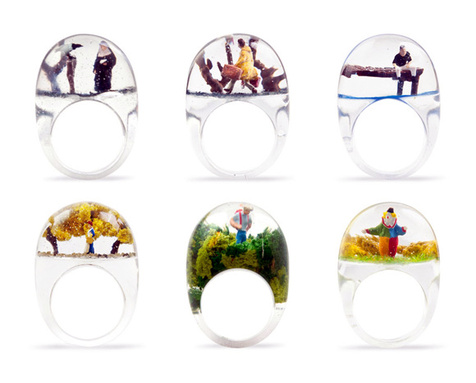 每一枚戒指都會有一段動人的故事,或熱烈或恬靜、或苦澀或甜美,總之擁有它的人一定會知道其中的滋味。香港設計師用幾米漫畫講故事的方式將微觀場景置于小小的戒指當中,讓人很容易被這些被縮放了的浪漫景色勾起對往日美好時光的回憶。每枚戒指里的故事都有著不同的主題,從童真童趣到雪地里的修女,從遠行的婦女到鄉村的生活……戒指里面的世界如同童話般一樣令人向往,如果能夠選一枚送給心愛的人珍藏那就再好不過了。