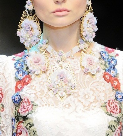 繁復的印花,宮廷感十足的剪裁,大量的珠寶配飾,DOLCE&GABBANA 2012秋冬秀場用驚艷來形容絕對不為過。這一季模特所佩戴的發飾、耳環、項鏈以及手鏈都極具有巴洛克風情,雖然繁復,但美得窒息。閃亮的吊墜長耳環&皇冠頭飾搖曳生姿,仿佛一位位從畫中走出的女子。