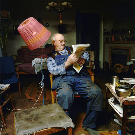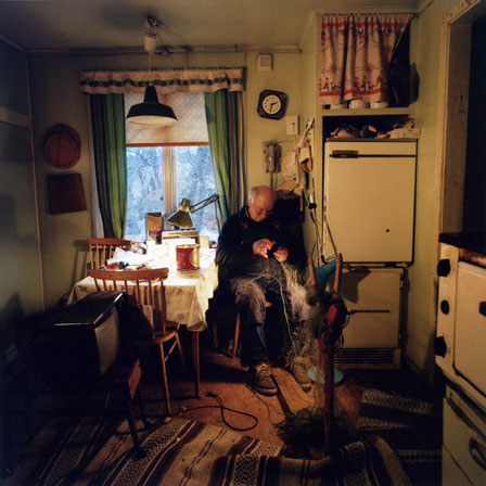彼得·德·魯(Peter de Ru)拍攝的這位叫做Sven的老人,運(yùn)用方畫幅以及質(zhì)樸的記錄手法,描繪了老人生活中的點(diǎn)點(diǎn)滴滴,透過(guò)這些片段,還原了一個(gè)孤獨(dú)老者的生活狀態(tài):從他采收的蘋果、丟棄的廢電池、寫滿了各種標(biāo)記的日歷牌,到他穿著滿是污漬的工作裝在起居室看報(bào)、在電視旁修補(bǔ)漁網(wǎng),在凌亂的廚房里準(zhǔn)備冬日的儲(chǔ)藏,觀看者由 此構(gòu)建起自己的印象,關(guān)于這個(gè)老人,關(guān)于他生活的環(huán)境。我們看不到老人生活中還有其他家人的影子。單純從照片來(lái)看,我們可以想象這是北歐典型的孤獨(dú)老人的生活。