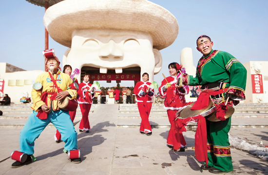 一支民間花鼓隊在萬榮縣笑話博覽園門前為游客表演花鼓