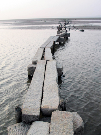 千眼橋位于都昌多寶西山蔣公嶺腳下的鄱陽湖水底,屬于江西省文物保護單位。橋長2930米,寬1.2米,長條花崗石鋪成橋面,松木大柱立于湖泥中支撐橋面。因為泄洪孔共983個,故得名為“千眼橋”,也稱“千孔橋”。自古以來,都昌至星子、廬山去潯陽,翻蔣公嶺,過鄱陽湖是必經(jīng)之路,夏季漲水有船可渡,冬季枯水則要蹚水踏泥跨湖,北風(fēng)凜冽,涉水者往往苦不堪言。明崇禎四年,為官都昌的錢啟忠領(lǐng)倡捐俸集資,歷時五年,在此橫跨江流,建造此橋,故又名錢公橋。從此,千眼橋成了都昌、星子兩縣沿湖民眾便捷往來的要道。