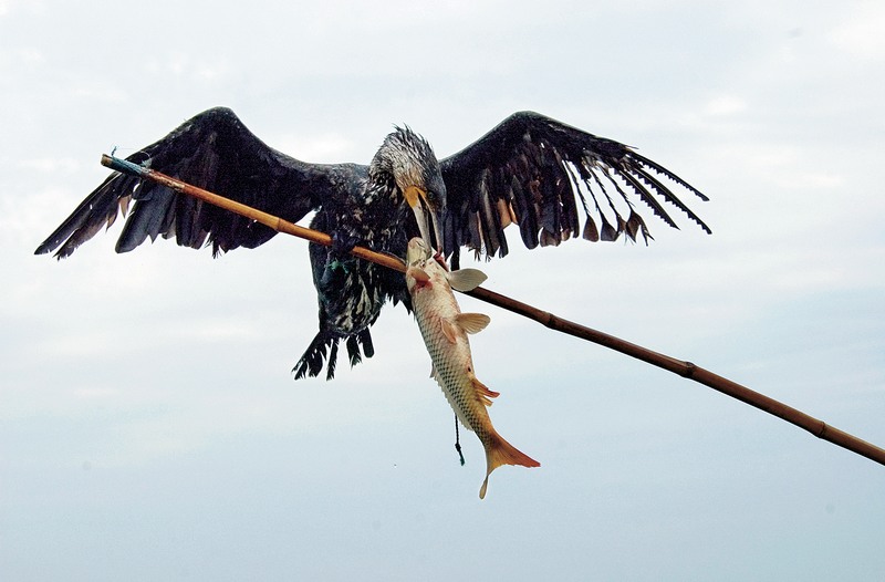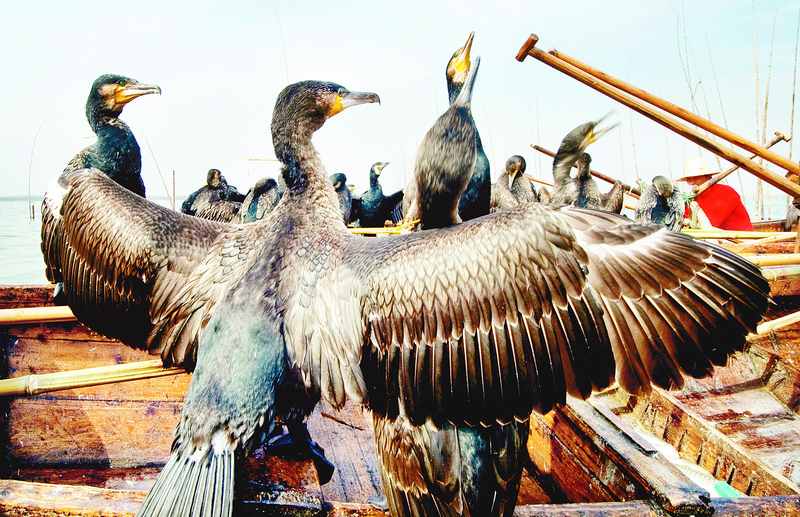 鸕鶿,江南的土話喜好叫其“魚鷹”,動作如其名,捕魚之時如老鷹一般矯捷敏銳。它們時兒潛入水中,時兒露出水面,方才清風徐來、水波不興的湖面頓時便被數十只鸕鶿攪得沸沸揚揚。待捕到魚后,先貯藏在喉囊中,漁夫只伸出竹竿,鸕鶿便跳躍其上,竹竿再那么往漁舟上一搭,便又上來了。漁夫的動作輕車熟路,鸕鶿的跳躍更是平步青云。