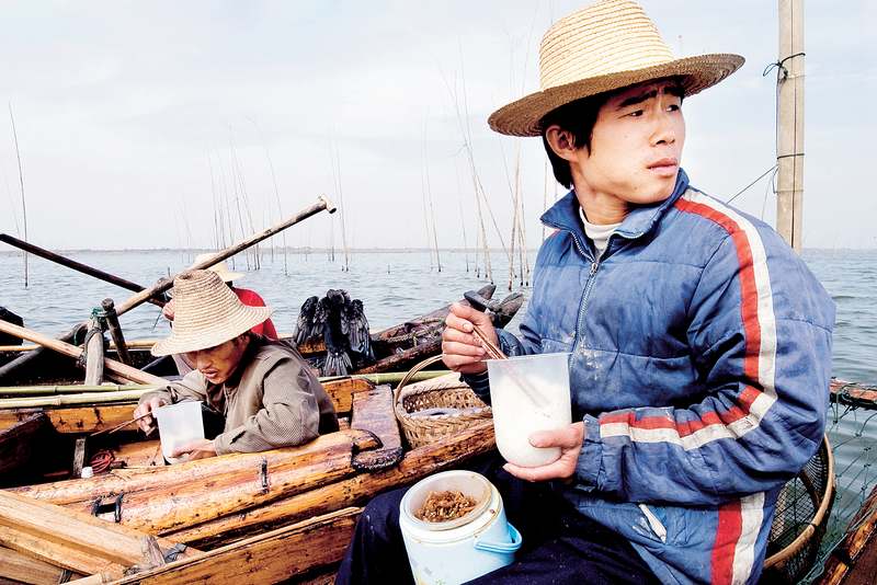 鸕鶿的頸部綁著麻環,防止它們吃掉捕到的魚。待鸕鶿抖落毛上的水珠,漁夫用手抓住喉囊,那么一拿捏,囊內的魚便逐條轉個方向,順著魚鰭的方向把魚擠出來。每每我看到這里,總是感到莫名的興奮,看到船艙中逐漸堆積起來的大大小小的群魚時,我就會吧唧下自己的嘴巴,仿佛喝到了美味的魚湯。