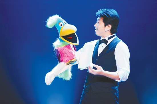 來自中國(guó)臺(tái)灣的魔術(shù)師劉成,展現(xiàn)了他獨(dú)具特色的魔術(shù)《腹語》。他的表演不僅是舞臺(tái)上獨(dú)立的演出,也重視與觀眾的互動(dòng)。他右手臂端著一只玩偶鸚鵡上場(chǎng),正在觀眾不知將要發(fā)生什么的時(shí)候,鸚鵡開口說話了,緊接著劉成與鸚鵡一對(duì)一答,流暢的對(duì)話讓觀眾贊嘆不已。雖然對(duì)于魔術(shù)表演來說,這不能稱為神秘,因?yàn)橛^眾都看出來了其實(shí)都是劉成一人在說話,但是劉成精湛細(xì)膩的技術(shù)不得不讓人心服口服。鸚鵡時(shí)而霸道、時(shí)而嬌羞、時(shí)而憤怒、時(shí)而乖巧,讓在場(chǎng)的觀眾尤其是小朋友們過足了癮。與此同時(shí),他還不忘給觀眾解密鸚鵡的嘴巴是如何靈活的一張一合。他從現(xiàn)場(chǎng)找來一位朋友上臺(tái)配合他表演,他將事先準(zhǔn)備好的道具(大嘴猴臉的下半部,按動(dòng)按鈕可以使嘴巴開合自如)戴在這位朋友的臉上,然后按動(dòng)按鈕,同時(shí)自己開始與他對(duì)話,同樣的效果在這位朋友身上再次上演,對(duì)著臺(tái)下的夫人說“我愛你”、單膝跪地演唱《月亮代表我的心》等等滑稽可笑的表演讓現(xiàn)場(chǎng)笑聲不斷。