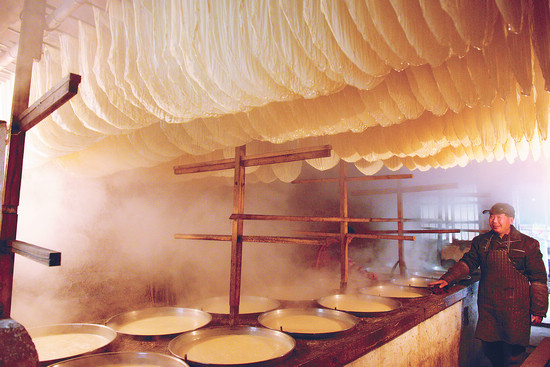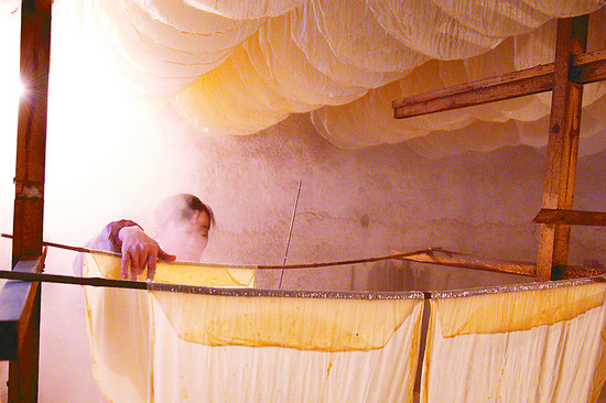 將結出的腐皮用竹棍挑出,進行初步晾干