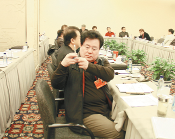 3月6日,全國政協十二屆一次會議小組討論會上,黃宏委員拒絕了在會議上簽名的請求,并要求保持安靜。 中新社發 杜洋 攝