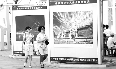 7月16日,往來游客在王府井步行街觀看“善美保定好風光”全國攝影展。當日,“善美保定好風光”全國攝影展在北京王府井舉行。本次攝影展以“善美保定”為主題,從“風光無限好”“文明千古頌”“幸福滿城鄉(xiāng)”“古城在騰飛”四個角度展現(xiàn)了保定過去、現(xiàn)在和未來的無窮魅力。本次展覽將持續(xù)至本月19日。
