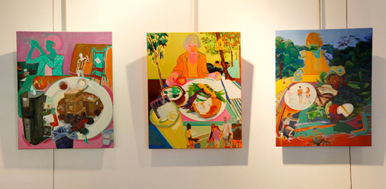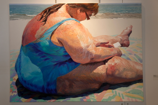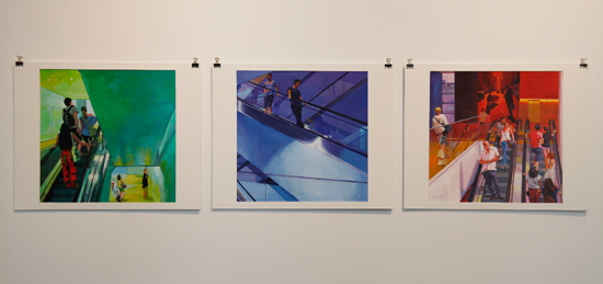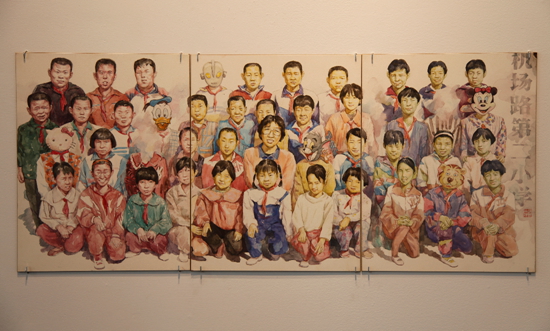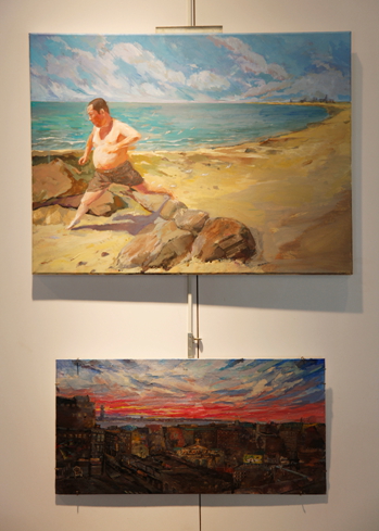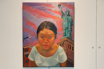 來自中央美院的年輕藝術家在紐約游歷創作的作品,融入了文化沖擊帶來的新鮮元素,又隱含著在新文化中的焦慮感。紐約街頭的多元文化特征體現在杜鵬驕和丁鈺的作品。杜鵬驕抓住了這個五光十色的大都市不同族裔、職業、性別的面孔,拼貼在一起,像是快速閃回的膠片。丁鈺則捕捉了在時代廣場跳動的股票信息前的一張亞洲面孔——充滿好奇的自己的面孔。魏穎同樣也畫了自畫像不過她所表現的是處于畫室內的場景,畫面中鏡子分割了遠處的風景,同樣自身也處于風景之中。而趙沛然及曲丹兒把自己的切身感受明確的體現在畫面中,前者畫了MOMA美術館彩色燈光的扶梯,用幾何分割的構圖試圖闡釋人與人,人與空間的關系,后者則是把在紐約生活的瑣事串聯起的細節以一種超現實的手法,錯亂的空間,以及斑斕的色彩記錄在畫面中。范墨把他童年記憶中的集體合影中移植入美國文化的卡通符號。袁偉和周棟則抓住了美國中產階級夏日的典型生活——海灘度假。周棟筆下的胖女人專心地曬著太陽,用粗獷的筆觸表現出曬紅皮膚上新鮮泥土的痕跡。苑瑗以一組尺寸可變的小油畫表現了自己在紐約的狀態,沒有摩天大樓和車水馬龍,安靜的湖泊和星辰讓人出離喧囂。趙一霓的一組風景油畫延續了自己對中國傳統文人畫內觀境界的追求,近乎抽象的線條注重對內心的反映,藝術家說在紐約的體驗讓她找到了更準確的語言,在圖像的表達上也更自由。李興達的《墻》則用幽默的語言反映出無所不在的隔閡。自由女神、毛澤東和麥當勞小丑站在紀念碑的基石上,以統一的姿勢揮手。觀者的視線被雕像前橫空出現的籬笆所阻擋,不知自己身處墻內還是墻外。