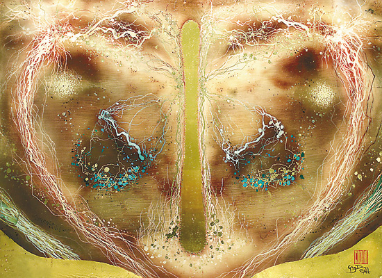 這幅畫是對視網膜分層結構的一種水墨描繪。畫的上方是感光體,下方是神經節細胞,光信息經過這兩處之后,被傳到丘腦和視覺皮層,進行更進一步的解讀。