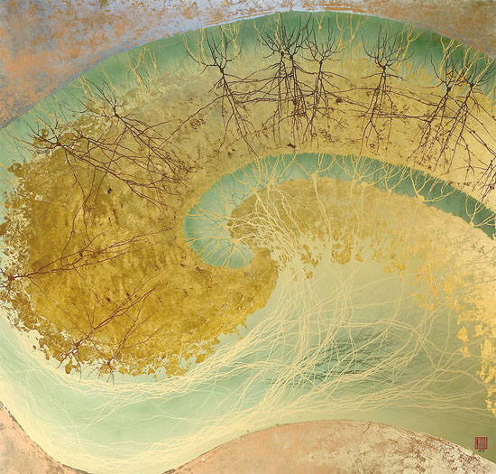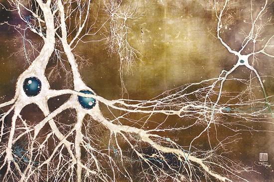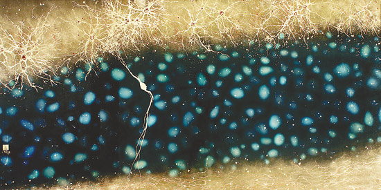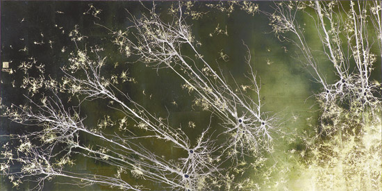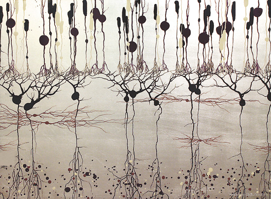 鄧恩在顯微鏡下看到的一切,讓他想起了整潔優雅的竹制卷軸畫和一些其他形式的亞洲藝術,于是他開始用一種類似的形式來畫神經細胞。他結合自己發展出來的技法對傳統水墨畫進行了補充,比如把墨水滴吹到介質表面上,墨水滴的擴散方式像極了神經元的生長形態。鄧恩說道,由自然力量推動,但在遇到微觀障礙時,會隨機形成分支越過障礙。“我喜歡以類似的力量來畫畫,并形成一種藝術”,他說。