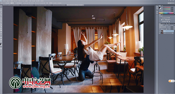 在PS里打開場景圖和人物圖,按住Shift鍵用鼠標(biāo)將人物圖拖到場景圖當(dāng)中。這樣兩張圖就會完全對上。