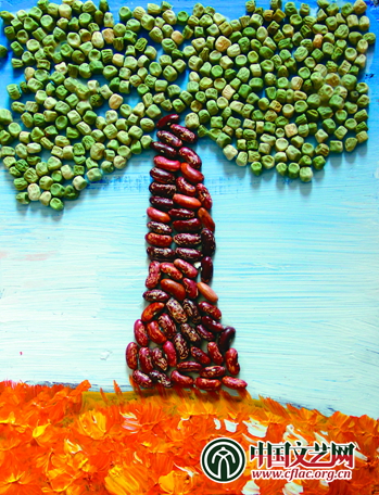 上美術課缺乏繪畫材料,金莉說,一盒蠟筆要全班輪著用。鄭玉龍來三股水小學支教恰逢秋季,各種顏色的種子刺激了他的視覺神經,顏料短缺可不可以用種子創作呢?鄭玉龍把突發奇想變成了現實。在他的指導下,學生們拿著紅豆、黑豆、黃豆、豌豆、玉米粘在從后山施工處撿來的經過處理的木板上,這些平常看起來很不起眼的種子,經過小朋友的一雙巧手搖身一變,長頸鹿、小蝴蝶、椰子樹、小綿羊、大黃牛、燕尾魚活靈活現,小朋友們很驚喜,老師們很欣喜。這種創作方法在支教隊伍里得到了進一步的擴展,生活中只要是有顏色的物品皆可作畫,小朋友用火柴棍做成了楊柳和校園,用煙盒做成了機器人,妙趣橫生。有時候沒有彩筆就用彩紙剪成想要的形狀,做貼畫。