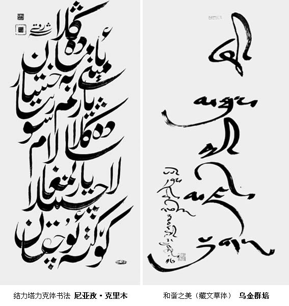 在另一個(gè)層面上,發(fā)展少數(shù)民族文字書(shū)法,還可以促進(jìn)民族文化形式的豐富多樣,成為凝聚民族團(tuán)結(jié)的有力工具,這也是何奇耶徒認(rèn)為的,應(yīng)該從政治高度和文化高度上去重視少數(shù)民族文字書(shū)法發(fā)展的原因——“對(duì)少數(shù)民族文字書(shū)法的認(rèn)識(shí)研究,會(huì)促進(jìn)中國(guó)書(shū)法向更高境界發(fā)展。通過(guò)更多的展覽,讓更多的書(shū)家去認(rèn)知少數(shù)民族文字書(shū)法,從中吸取營(yíng)養(yǎng),在中華文化的大概念之中,均衡發(fā)展少數(shù)民族文字書(shū)法,這將極大豐富中國(guó)書(shū)法文化。” |