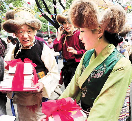 7月12日,慶祝西藏和平解放60周年獻(xiàn)禮叢書首發(fā)儀式在拉薩市舉行。這批叢書是宣傳思想文化戰(zhàn)線向西藏和平解放60周年獻(xiàn)上的一份厚禮,經(jīng)過(guò)精心策劃確定了28種重點(diǎn)出版選題,其中《西藏的昨天、今天和明天》《西藏今昔》等圖書被中宣部、新聞出版總署列為慶祝建黨90周年重點(diǎn)出版物,《安居樂業(yè)在高原》《重走解放軍進(jìn)藏路》等10種圖書被自治區(qū)大慶辦列為大慶獻(xiàn)禮圖書。圖為來(lái)自拉薩市堆龍德慶縣桑木村的次旺羅布(左)和卓瑪次仁(右)懷抱獲贈(zèng)圖書。