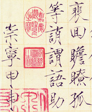 宋徽宗瘦金體《千字文》是中國(guó)書(shū)法史上的赫赫名跡,現(xiàn)藏于上海博物館,縱30.9厘米、橫322.1厘米,朱絲界欄,素箋本,書(shū)法落款亦為“崇寧甲申歲宣和殿書(shū)賜童貫”,并有大量鑒藏印如“乾隆御覽之寶”、“嘉慶御覽之寶”、“宣統(tǒng)御覽之寶”、“安儀周家珍藏”等。