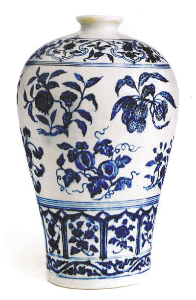 明永樂“青花如意垂肩折枝花果紋梅瓶”,高36.5厘米,紋樣細膩柔美,形制比例得當,是一件難得的永樂瓷器杰作。2011年10月5日,在香港蘇富比秋拍中以1.383億元人民幣成交,刷新了明代中國瓷器拍賣世界紀錄。