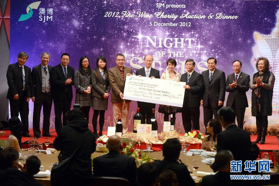 ??? 12月5日,主辦單位將善款支票贈于澳門9家慈善機構。 12月5日,極品名釀慈善拍賣晚宴在澳門舉行,慈善晚宴拍賣3組珍貴的法國名釀,共為澳門9家慈善機構籌得457萬澳門元。 (新華社記者 張金加 攝)