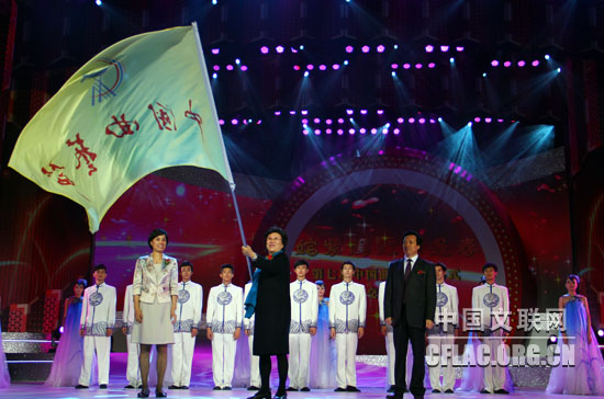10月23日晚,第七屆中國(guó)曲藝節(jié)在紹興閉幕。圖為劉蘭芳主持中國(guó)曲藝節(jié)會(huì)旗交接儀式。中國(guó)文聯(lián)網(wǎng) 董大汗 攝