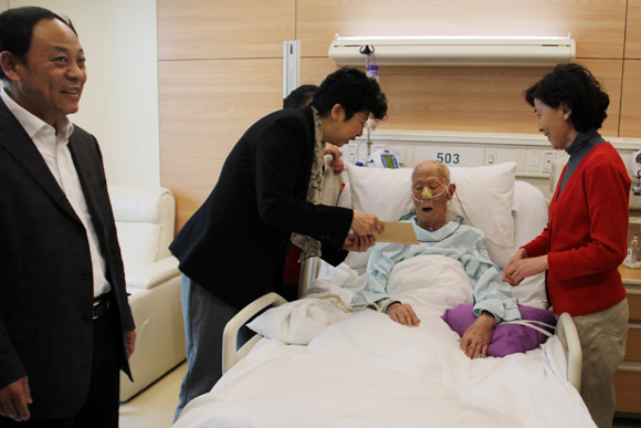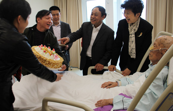 4月23日下午,中國文聯(lián)黨組書記、副主席趙實,黨組成員、書記處書記夏潮,中國影協(xié)分黨組成員、副秘書長謝力來到北京協(xié)和醫(yī)院,看望大病初愈的百歲影人于敏,并慶賀他的百歲壽誕。