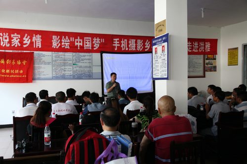 授牌儀式結束后,志愿者們在漢王鄉建設村為30多名當地首批鄉村手機攝影會員講授了手機攝影輔導課程,這也是輔導站成立后的第一課。主講人、攝影志愿者吳歆結合當地實際,用簡單形象的語言,闡述了手機攝影的廣泛運用,傳授了手機攝影的拍攝技巧,受到會員們的好評。