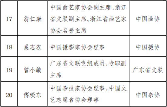 為了積極培育和踐行社會主義核心價值觀,大力弘揚“奉獻、友愛、互助、進步”志愿精神,培育志愿文化,發揮文藝志愿者先進典型示范引領作用,引導全社會向先進典型學精神、學品質、學方法,推動形成崇尚先進、見賢思齊的濃厚氛圍,經中央宣傳部批準,中國文聯首次開展了2025年度“ ‘時代風尚’文藝志愿者”宣傳選樹活動。經中國文聯各團體會員推薦、專家推選、社會公示等環節,推選出2025年度“時代風尚”文藝志愿者20人,現予以公布。