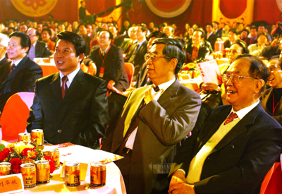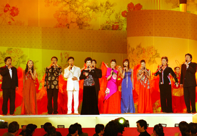 隨著新年鐘聲的敲響,趙忠祥、黃宏、沈冰、闞麗君四位主持人走上舞臺為大家送上春天的祝福。在大家的喝彩聲中,他們朗誦了代表中國文聯和各文藝家協會一年來藝術成就的12幅對聯。分別為:“梅花二十載裝點山河多錦繡,戲劇數百年歷史畫卷更輝煌”(中國劇協);“金雞報曉大地是希望的田野,百花爭艷銀幕乃理想之花園”(中國影協);“金鐘和鳴奏響時代主旋律,歌聲悠揚唱出人民愛國情”(中國音協);“金彩繪神州神州處處皆入畫,筆墨隨時代時代天天有詩篇”(中國美協);“相聲小品幽默開懷堪稱百姓心上牡丹,書曲唱曲蕩氣回腸勝似觀眾長壽良方”(中國曲協);“翩翩起舞盡顯荷花風采,款款登臺大展中華英姿”(中國舞協);“民間文藝山花爛漫三貼近,搶救工程浩蕩空前一奇觀”(中國民協);“按一次快門凝固金像之美,拍有數畫面寄托無限真情”(中國攝協);“弄潮墨海研讀經史蘭亭群英會,弘揚傳統與時俱進妙筆寫新風”(中國書協);“挑戰極限超越自我金菊吐芬芳,攀登高峰勇立潮頭吳橋連世界”(中國雜協);“電視熒屏五彩繽紛精品如雨后春筍,金鷹展翅鵬程萬里前程似錦繡鋪成”(中國視協);“幾代藝術家辛勤耕耘百花齊放,無數好作品陶冶情操百家爭鳴”(中國文聯)。隨后,精彩的節目逐一上演。王昆寶刀不老,唱起《白毛女》的著名選段《北風吹》原汁原味,舞蹈新秀紀婷婷的一段芭蕾再現了這一經典。大家可能從沒聽到過于魁智唱黃梅戲,趙葆秀唱豫劇,小香玉唱京劇,楊春霞唱滬劇,在這次晚會上都可一飽“耳”福。吳雁澤、張也、王玉珍、宋祖英、殷秀梅、關牧村唱起一些大家耳熟能詳的老歌,場下觀眾都不約而同地和著輕輕哼起來。朱軍、周濤、文清、張政、蔡明的搞笑小品逗得現場觀眾直不起腰來。而劉蘭芳、侯耀文、姜昆、潘長江的曲藝大合唱既輕松又新穎。節目高潮迭起,中國舞協的舞蹈《萬紫千紅》近十對演員發揮了中國舞蹈金獎的最高水平,一人一段令人目不暇接;80歲的老舞蹈家賈作光上臺和年輕人跳起了蒙古族舞蹈,臺下的觀眾都感受到老藝術家年輕的心。馮鞏、黃宏、倪萍、孔祥東、劉大為、陳佩斯、朱時茂、劉斌、楊洪基、夢鴿、譚晶等著名藝術家也先后登臺,或擔當主持人,或參與表演,精彩的節目把晚會的氣氛推向了高潮。晚會還吸引了趙薇、陸毅、陳坤等新人的參加,他們的表演則讓大家看到了文藝園地中新的生機。