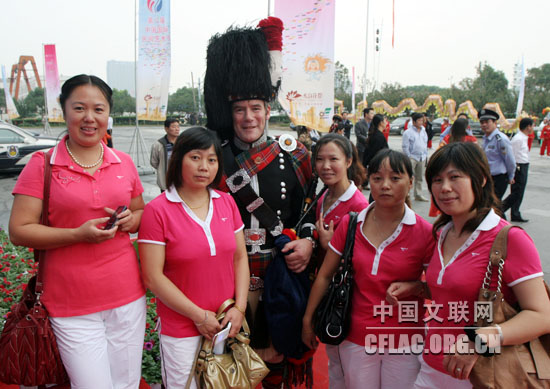 10月7日晚,由中國文聯和江蘇省人民政府共同主辦,江蘇省文化廳、江蘇省文聯、蘇州市人民政府聯合承辦的第八屆中國國際民間藝術節,在蘇州工業園區科技文化藝術中心隆重開幕。藝術節期間,來自世界五大洲14個國家的1200多名中外藝術家,在江蘇蘇州5市7區,采用舞臺演出和即興展示相結合的方式進行巡回展演。圖為國外藝術家與蘇州粉絲合影。中國文聯網 孟祥寧 攝