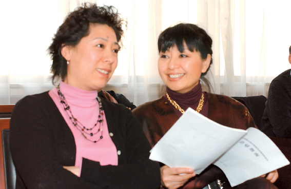 才旦卓瑪(左)和白淑湘在交流會議報告。