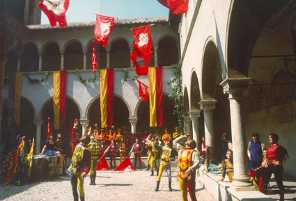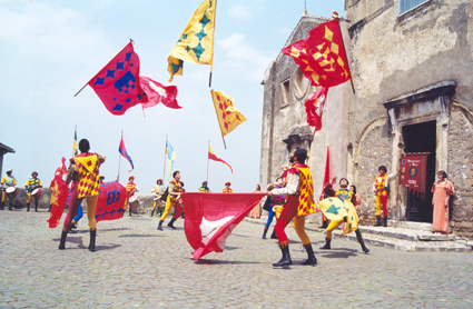 來自意大利科里地區(qū)的旗舞團(tuán)已經(jīng)有38年的歷史了。該團(tuán)的旗舞源于16世紀(jì)意大利文藝復(fù)興時(shí)期所表演的“古代揮旗藝術(shù)”。表演者身著不同顏色且十分昂貴的服裝,在有節(jié)奏的鼓號(hào)相伴下,揮舞各色的旗幟,營造出頗具動(dòng)感又如雜技般高難動(dòng)作的舞蹈場景。旗子上的圖案有的是武器的樣子,有些顏色代表不同的行政區(qū)。